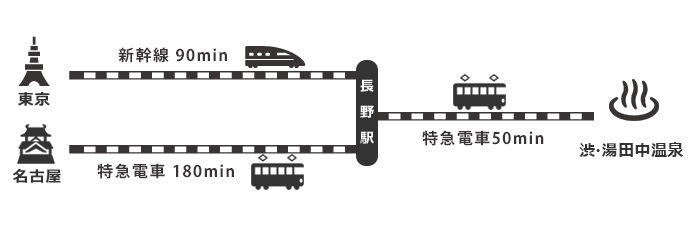 渋・湯田中温泉へは、まずは新幹線や特急を利用して長野駅まで行くのが早くて便利です!長野駅からは特急電車へ乗り換えて50分程で到着です♪