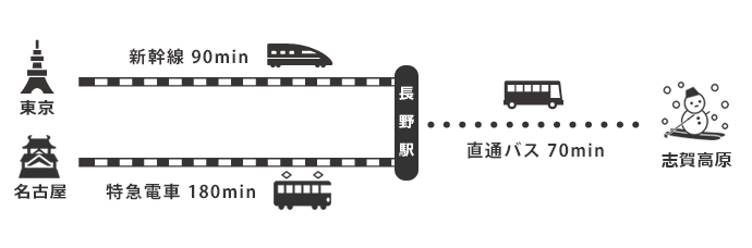 志賀高原へは、まずは新幹線や特急を利用して長野駅まで行くのが早くて便利です!長野駅からは直通バスで70分程で到着です♪